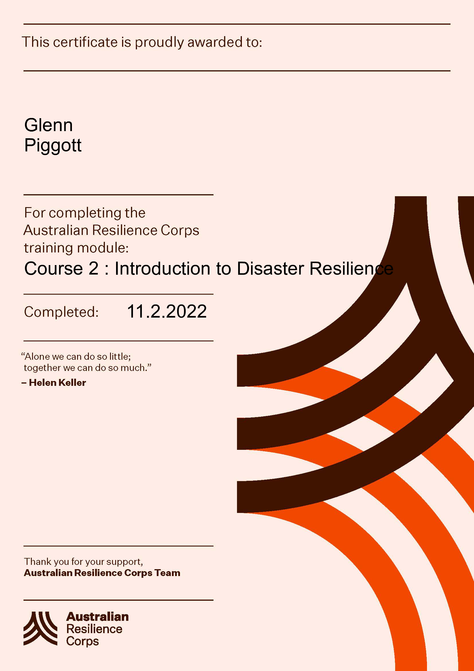 Glenn Piggott has completed the course Course 2 : Introduction to Disaster Resilience within one of Learnt's customer portals, AUSTRALIAN RESILIENCE CORPS.